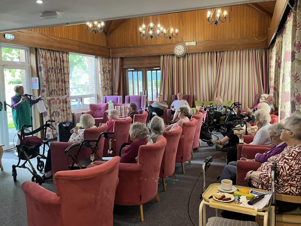 Annie Valery by Rachel Cookson | Jun 14, 2024 | Hewlett Court News and Events Annie Valery came to perform for the ladies and gents on Friday 14th June and what a delight it was! Everyone enjoyed joining in with songs and enjoyed a tipple while they watched the performance.