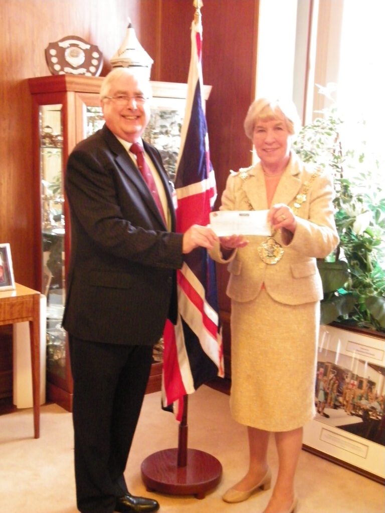District Charity Steward Steve Clark met up with the Mayor, Cllr Gunther, in her parlour at the Town Hall to be able to hand over a cheque for £1,000 from the ELMC which will go towards her fund raising this year.