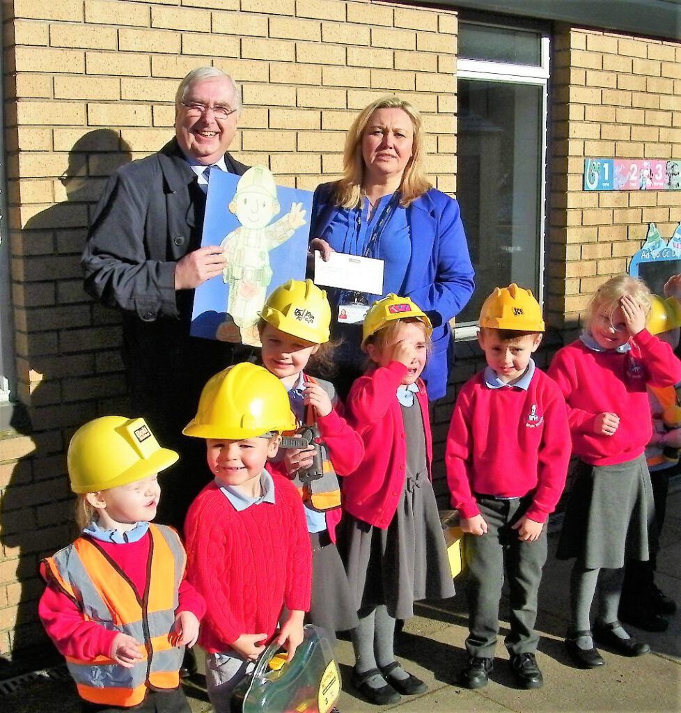 Bury District Charity Steward Steve Clark and his wife Sandra visited the school to present a cheque for £1,000-00. The pupils gave Steve a huge “Bob the Builder” thankyou card which was signed by all of the EYFS children, and they presented Sandra with a bouquet of flowers.