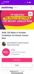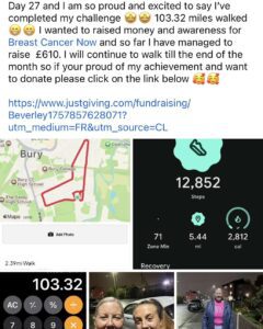 A big well done to Manager, Bev for completing her challenge of walking 100 miles in October to support Breast Cancer Now and raising a fantastic £700 + £123.75 gift aid!